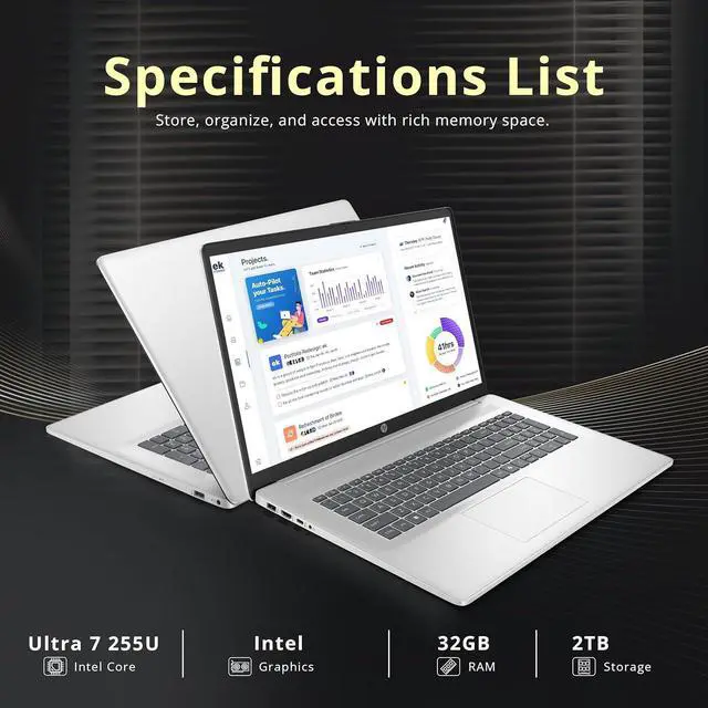 The HP 17.3" HD+ Touchscreen Laptop offers smooth business performance with the Intel Ultra 7 255U Processor and clear visuals via Intel Graphics.