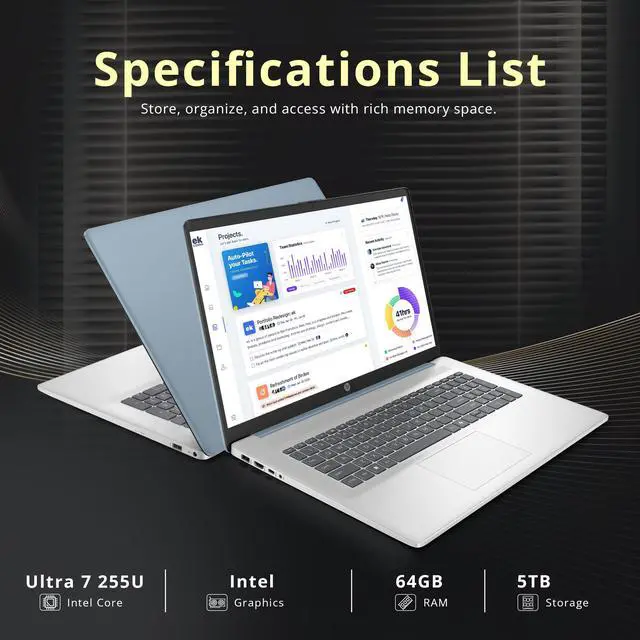 The HP 17.3" HD+ Touchscreen Laptop offers smooth business performance with the Intel Ultra 7 255U Processor and clear visuals via Intel Graphics.