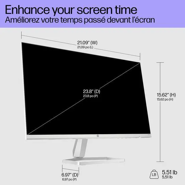 OverviewGet lost in any passion project with the HP Series 5 23.8 -inch FHD White Monitor. Its sleek, thin-and-light design gives you the flexibility to enjoy entertainment while vibrant color and deep contrast ratio lets you see everything as it was meant to be seen. Enhance your screen time and your pastime with a higher refresh rate for a screen-tear-free experience. TiltWhat's in the box? Monitor; HDMI cable; Power adapter; AC power cord; Document kitDisclaimers All performance specifications represent the typical specifications provided by HP's component manufacturers; actual performance may vary either higher or lower.