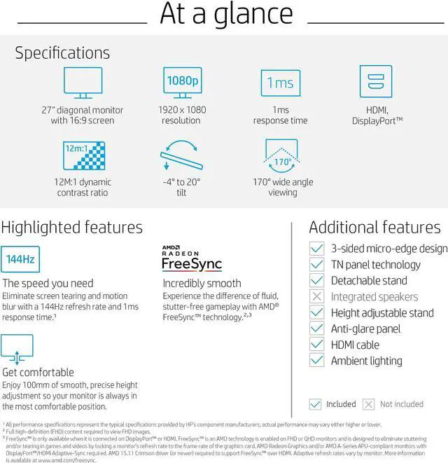 68.6 cm (27 in. ) Anti-glare; Language selection; LED backlights; On-screen controls; Pivot rotation; Plug and Play; User programmable FHD (1920 x 1080 @ 144 Hz) 1 DisplayPort 1.2; 1 HDMI 2.0