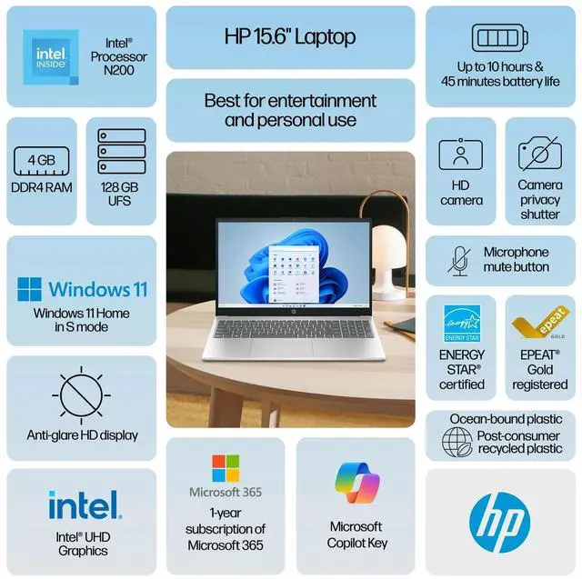 HP 15-fd0084wm 15.6" HD Laptop, Intel N200, 4GB, 128GB, Windows 11 Home