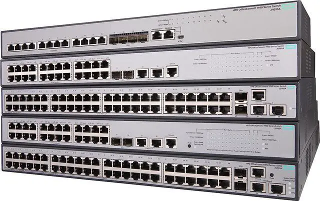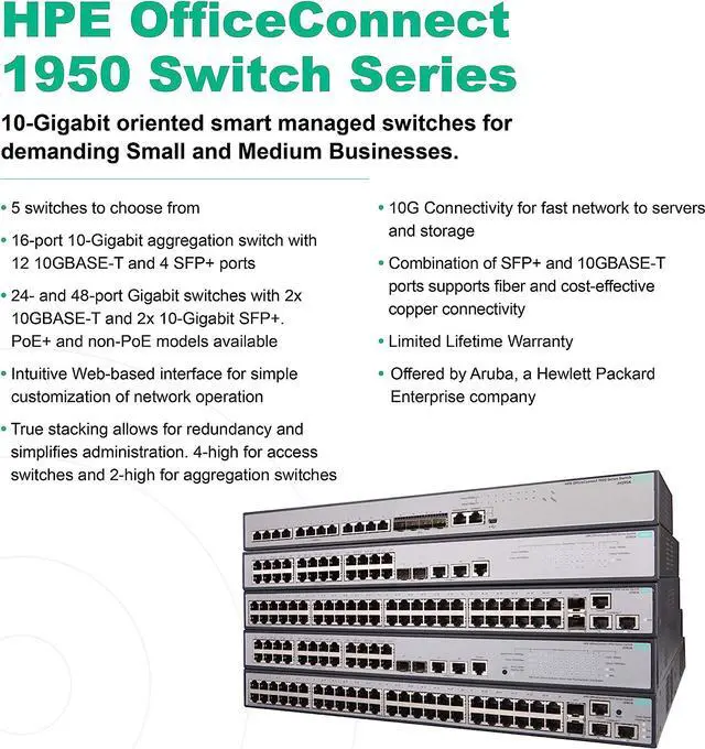 The HP 1950 Switch Series consists of smart web-managed Gigabit Ethernet switches with 10-Gigabit uplinks, for advanced small business customers needing high-performance connections to servers and network storage. The 1950