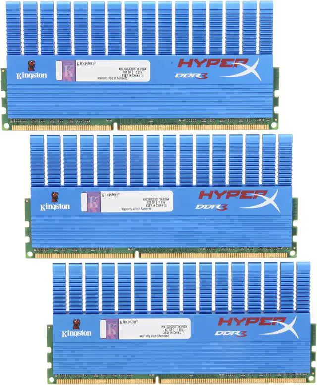HyperX T1 6GB (3 x 2GB) PC3-12800 (1600MHz) Triple-channel Desktop KitSpecifically optimized for Intel Core i7 processors, these high performance modules have been tested to run at DDR3-1600 at a low latency timing of 9-9-9-27 at 1.65V. The exceptional clock and latency timing greatly enhance overall system performance. An all new heat sink design achieves effective maintenance of speed while prolonging the memory lifecycle. Quench your thirst for a performance upgrade!