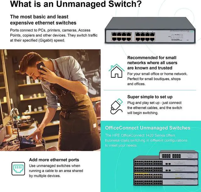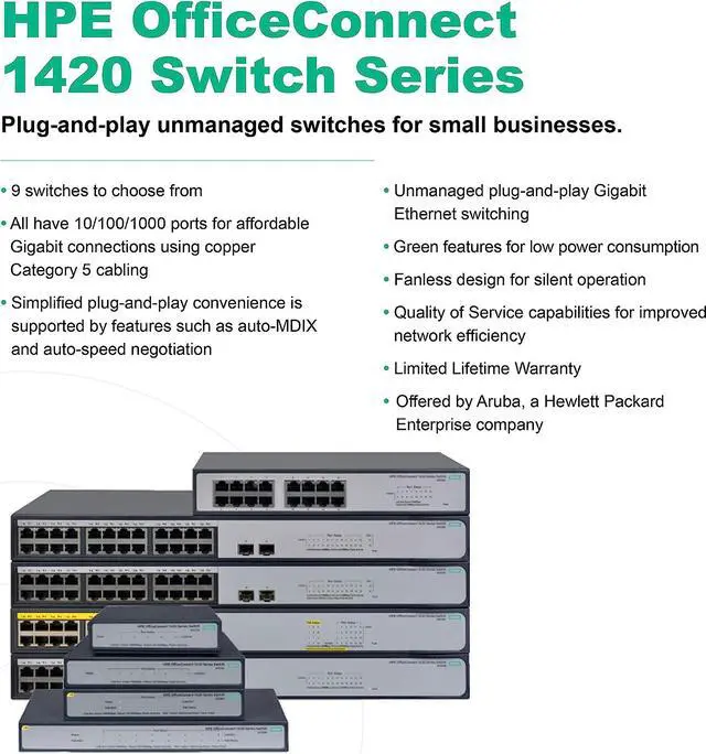The HPE OfficeConnect 1420 Switch Series features gigabit Ethernet (1GbE) connectivity offering small businesses 10 times the performance of Fast Ethernet with unmanaged plug-and-play simplicity.