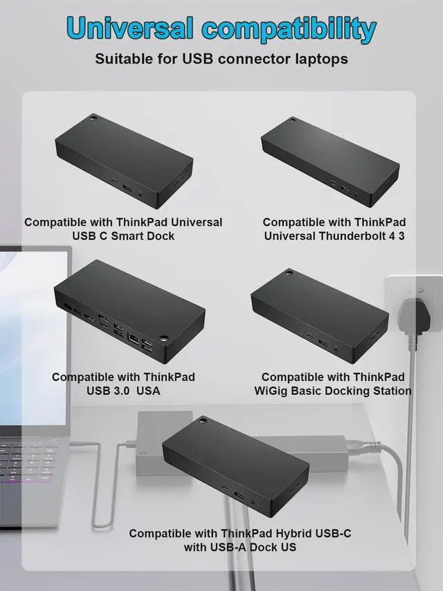 Compatible with Lenovo ThinkPad Universal USB C Smart Dock,ThinkPad Universal Thunderbolt 4 Smart Dock, ThinkPad Thunderbolt 3 Dock Gen 2/1st, Thunderbolt 3 Essential Dock Gen 2/1st, ThinkPad Thunderbolt 4 WorkStation Dock, ThinkPad Thunderbolt 3 Workstation Dock Gen 2/1st, ThinkPad Hybrid USB-C with USB-A Dock US, ThinkPad Ultra Docking Station, Thinkpad Pro Docking Station, ThinkPad USB-C Dock Gen 2/1st Docking Station