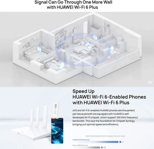 AX3 and Wi-Fi 6-enabled HUAWEI phones are the perfect pair because both are equipped with HUAWEI's self-developed Wi-Fi chipset, which supports 160 MHz frequency bandwidth. This lays the foundation for Chipset Synergy, bringing out optimal speed and efficiency.