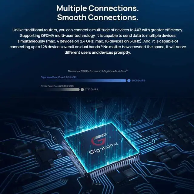 Unlike traditional routers, you can connect a multitude of devices to AX3 with greater efficiency. Supporting OFDMA multi-user technology, it is capable to send data to multiple devices simultaneously (max. 4 devices on 2.4 GHz, max. 16 devices on 5 GHz). The highly powered quad-core Gigahome CPU also ensures smooth running of the processor. And, it is capable of connecting up to 128 devices overall on dual bands.4 No matter how crowded the space, it will serve different users and devices promptly.