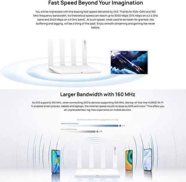 As AX3 supports 160 MHz, when connecting AX3 to devices supporting 160 MHz, like top-of-the-line HUAWEI Wi-Fi 5-enabled smart phones, tablets and laptops, the internet speed would increase 60% and more.5 This offers you an unprecedented, lag-free experience on mobile devices.