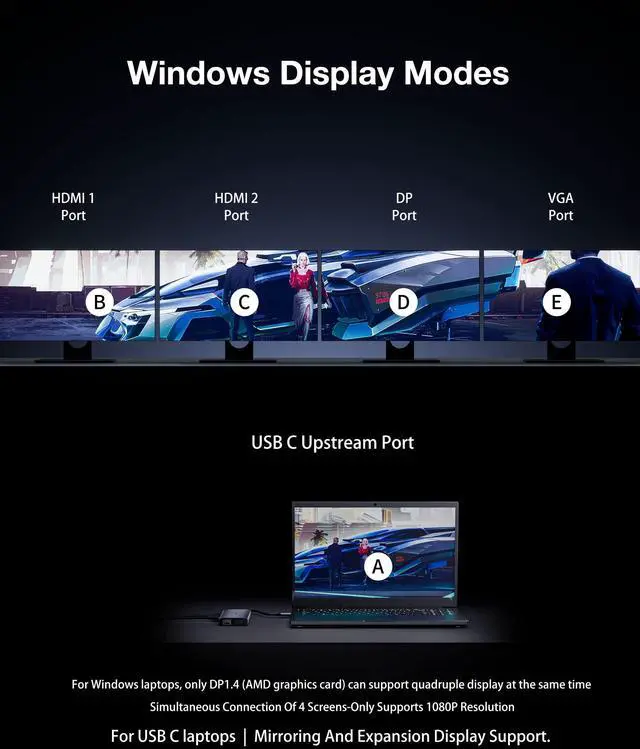 Windows OS supports multi-screen extension mode. The Laptop USB C Docking station has 4 video ports, including 2 HDMI, DP, and VGA, which are compatible with various displays. Multiple display interfaces can be freely combined, such as dual display, triple display, and quadruple display, to meet various office needs and enhance work efficiency. Note: To achieve four-screen display, your laptop needs to have DP 1.4 version (with an AMD graphics card). Otherwise, one of the screens will be black. If your laptop is DP 1.2 version, the overall resolution will be reduced, and four displays are not supported
