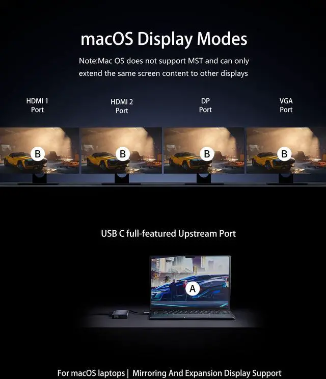 Note: MST (Multi-Stream Transport) allows multiple displays to be connected to a single DisplayPort or Thunderbolt port using daisy-chaining. However, macOS does not have native support for this feature