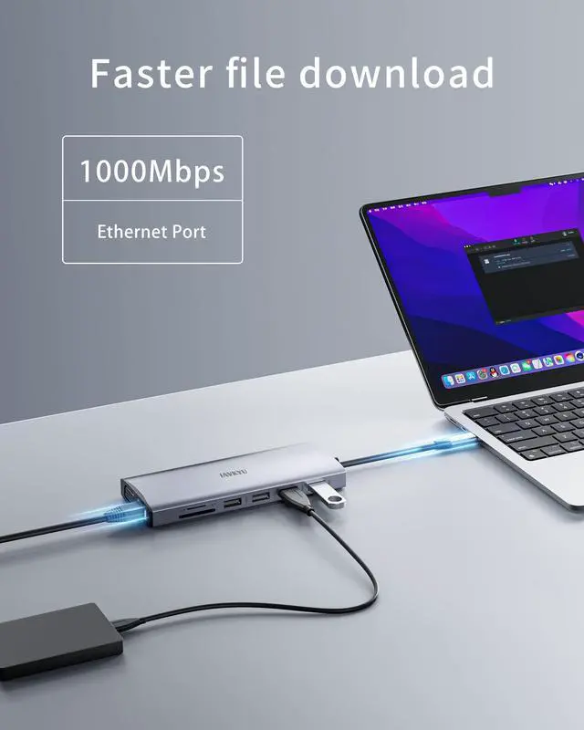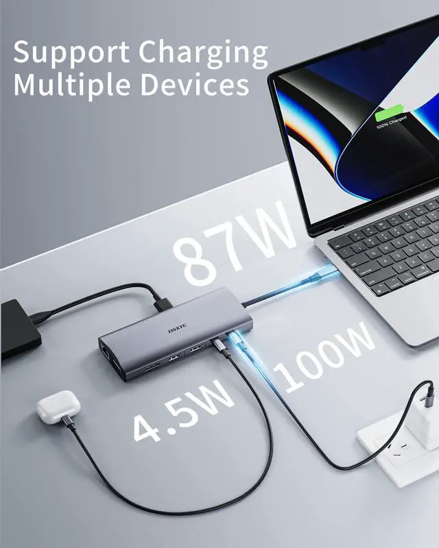 PD 3.0 100W charging interface, with its powerful 87W output, efficiently charges laptops, eliminating interruptions during work or entertainment and allowing you to focus on tasks or indulge freely. (It is recommended to use a 65W-100W power adapter for better results). It can also provide power to your external devices such as smartphones and smartwatches through the USB-A and USB-C data interfaces at a power of 4.5W, enhancing your charging experience