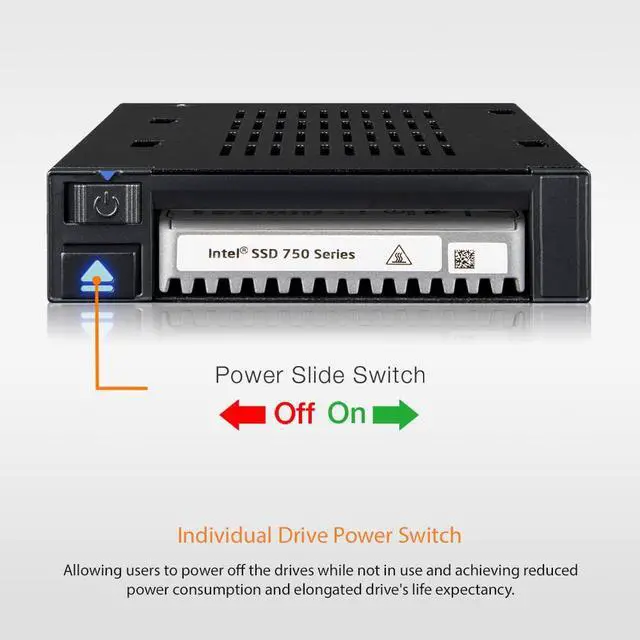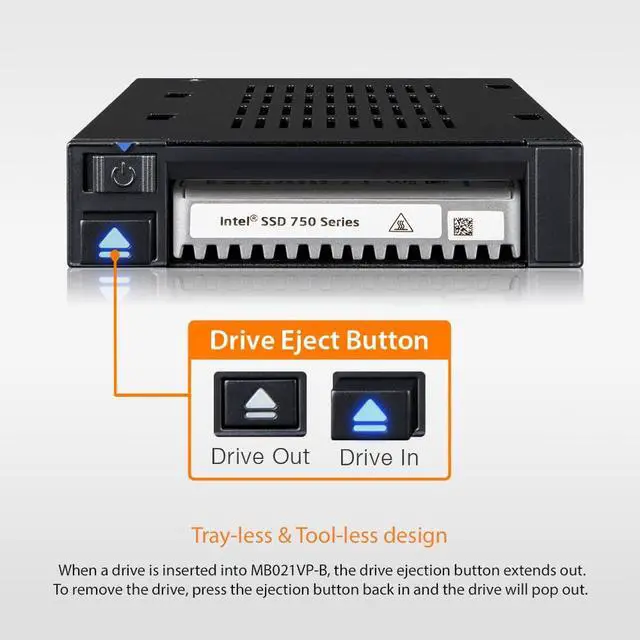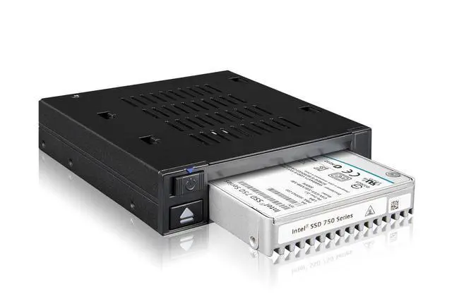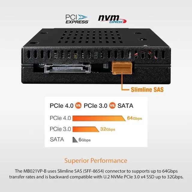 The flexiDOCK MB021VP-B is a compact U.2 NVMe PCIe 3.0/4.0 SSD mobile rack enclosure supporting up to 64Gbps data transfer speeds through a Slimline SAS (SFF-8654) connection. It fits into a computer cases external 3.5" drive bay (floppy bay) and allows tray-less & door-less drive installation and removal. Users can access their enterprise U.2 SSD without opening the computer case or using any tools or screws. Simply insert a U.2 SSD and switch on the drive power, you are all set to go.
