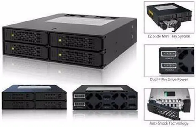 Introducing the MB994SP-4S, a full metal mobile rack backplane, capable of storing four 2.5" SAS / SATA SSD & HDD 6Gbps in a 5.25" device bay. This product is constructed of heavy duty metal to hold up in the toughest of conditions. It includes a LED is placed on the front of each drive tray and dual 40mm cooling fans to keep the drives running in at optimal temperatures, in even the most intense applications. The included EZ Slide Mini Trays also allows multi drive interchangeability between other compatible Icy Dock products. This device is suited for applications such as: Medical & Military systems, Media servers, IPCs, HTPC, and All-In-One computers.