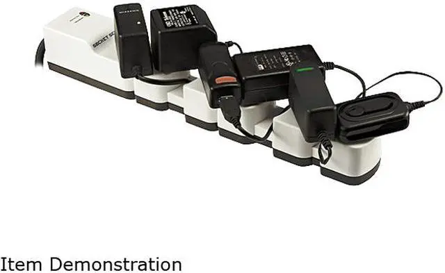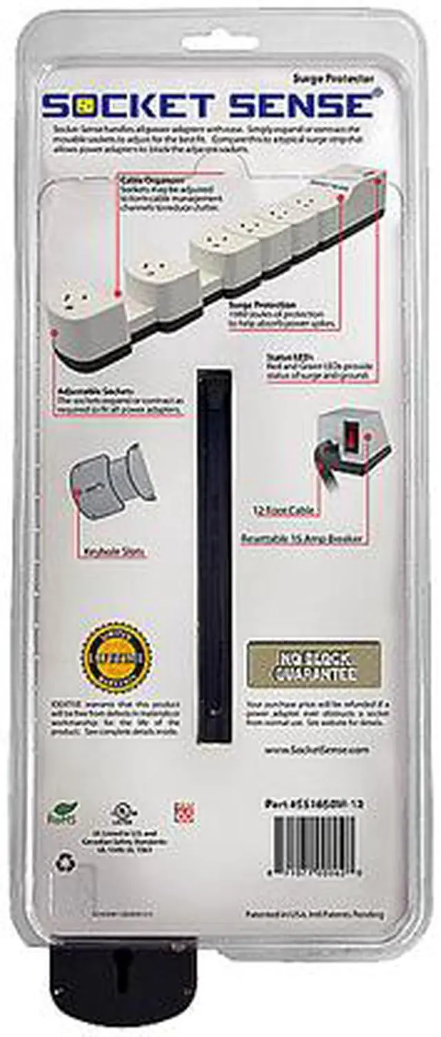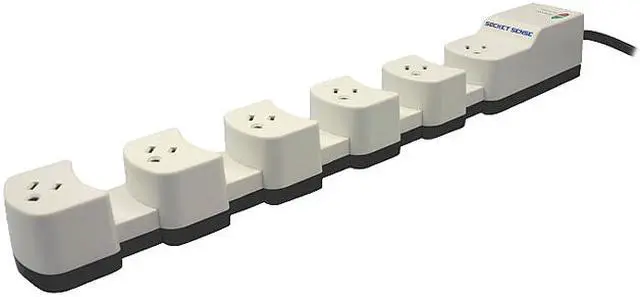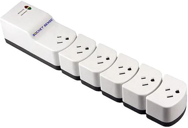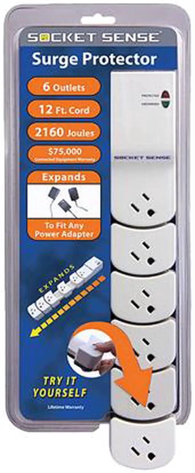 | Features | Socket Sense Surge Protector, 6 Outlets, 2160 Joules, White / Dk Grey, 12ft Cord, Clam Pkg. Socket Sense Handles All Power Adapters With Ease. Simply Expand Or Contract The Movable Sockets To Adjust For The Best Fit. |