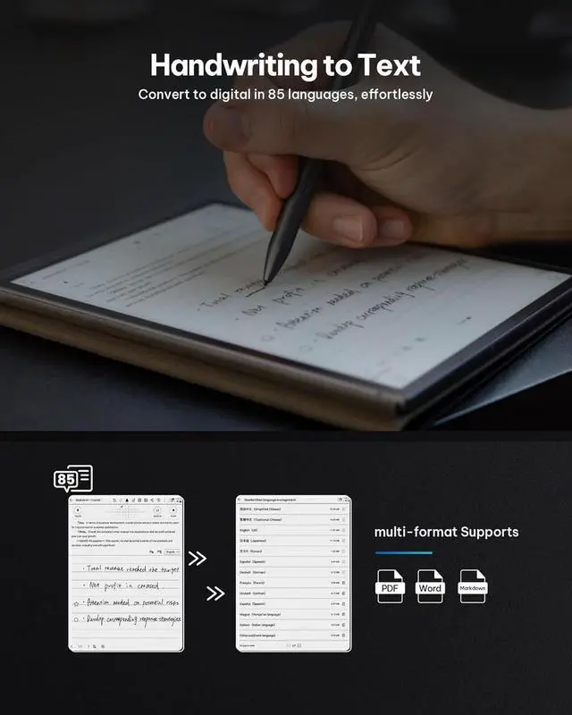 - Multi-Language Transcription SupportiFLYTEK AINOTE Air 2 writing tablet for adults supports fast and accurate transcriptions in 15 languages (EN/ES/CN/FR/SA/VN/KR/RU/DE/JP/HK/TH/ID/MY/HU). Additionally, it converts handwritten notes to text in 83 languages, making it a versatile e ink tablet for global users.