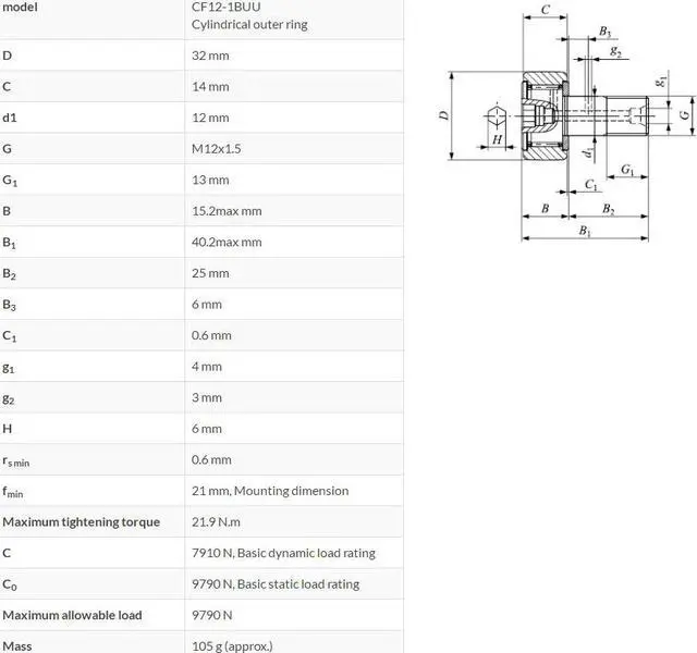 IKO CF12-1BUU Cam Followers, Cylindrical Outer Ring 32x12x14mm