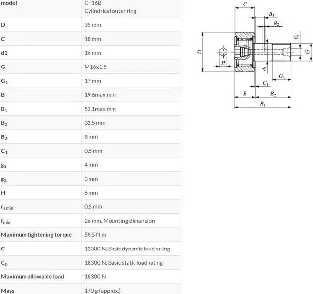 IKO CF16B Cam Followers, Cylindrical Outer Ring 35x18x16mm