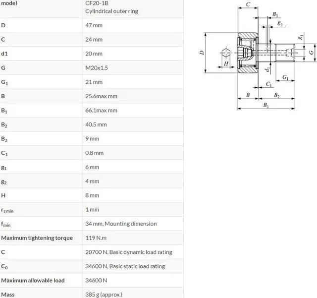 IKO CF20-1B Cam Followers, Cylindrical Outer Ring 47x24x20mm