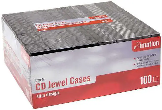 Each imation slim jewel case is about half the thickness of a standard jewel case, so you can store twice as many discs in the same amount of space. The cases come in sleek black, and they come 100 to a pack. Because they are thinner and lighter than standard jewel cases, these will ship at a lower postage rate than standard jewel cases, so you can send them off to clients economically!