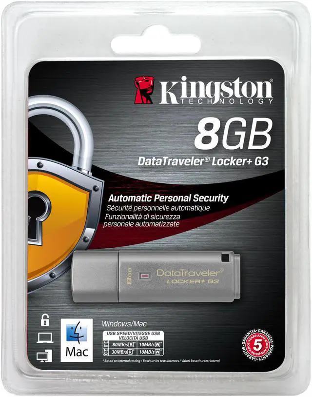 Easy-to-use personal data protection. Put a lock on your personal data with Kingston's DataTraveler Locker+ G3. It secures receipts, bank statements and other sensitive documents withhardware encryption and password protection for a double layer of data security. The drive locks down and reformats after 10 failed login attempts, sousers can rest assured that their data is safe even if the drive is lost or stolen. Its USB 3.0 interface delivers fast speeds that are approximately eight times the speed of the previous generation, to secure files faster. DataTraveler Locker+ G3 is easy for anyone to setup and easy to use, with no application installation required; all the software and security needed is built in.