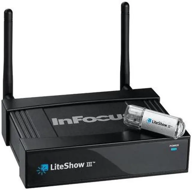 | Features | High speed and long range: The latest 802.11n wireless technology gives LiteShow III a fast transfer speed of 150 Mbps and has a reach of up to 300 feet (91 m). Seamless video Quick connection: Visitors who want to connect to LiteShow III can simply insert the LiteShow USB drive and start presenting. They don’t need special admin rights or to install any software. Control the display of multiple computers Four displays in one Configurable to fit your organization Multiple security levels Wireless presentation with access point |