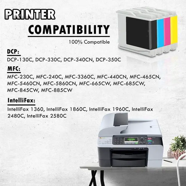 Compatible Brother Printer Models: DCP-130C, DCP-330C, DCP-340CN, DCP-350C, MFC-230C, MFC-240C, MFC-3360C, MFC-440CN, MFC-465CN, MFC-5460CN, MFC-5860CN, MFC-665CW, MFC-685CW, MFC-845CW, MFC-885CW, IntelliFax 1360, IntelliFax 1860C, IntelliFax 1960C, IntelliFax 2480C, IntelliFax 2580C.
