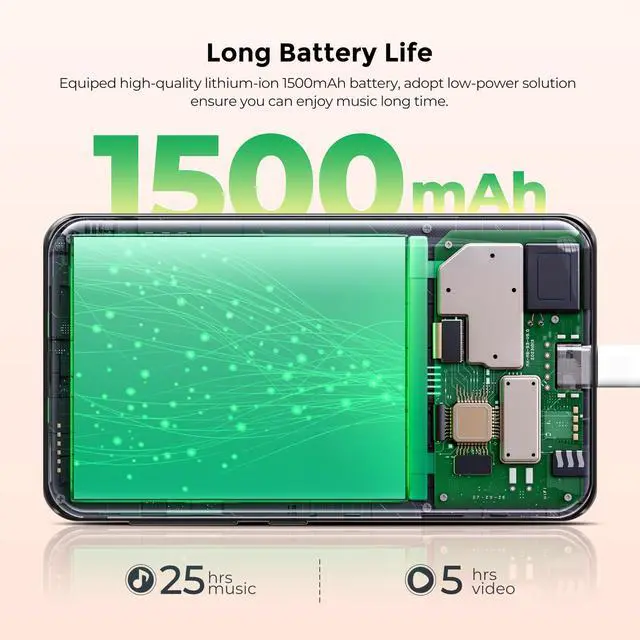 - 1500mAh Long Life Battery: This kids music player is equipped with a 1500mAh lithium battery and utilizes a low-power solution, enabling up to 25 hours of continuous music playback (with wired earbuds) or 5 hours of video. The spotify player features a Type-C charging port, and it takes just 2 hours to fully charge.