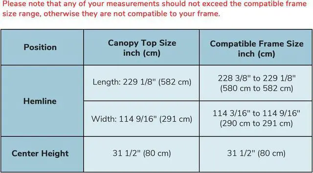 - Measurement Tips - Tips for you to determine whether your tent frame fits our canopy top: Measure the length, width and central pole height of your tent frame; Please make sure your measurements should not exceed the compatible frame size range