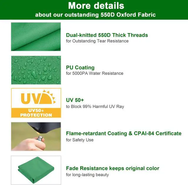 - Durable Fabric - Thickened 550D 155g Oxford fabric doubles the servicing life and features wear-resistance; CPAI-84 flame retardant fabric, meets the safety standard for outdoor commercial market & trade fair