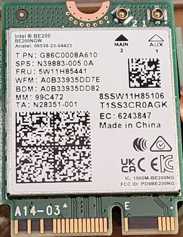 Brand Intel , Model BE200.NGWG.NV Product Collection Intel Wi-Fi 7 Series, Operating Temperature Range 0 oC to 80 oC, Max Operating Temperature 80 oC, Minimum Operating Temperature 0 oC, Supported Operating Systems Windows 11, Windows 10, Linux, Antenna 2x2, Networking Specifications TX/RX Streams, 2x2, 320 MHz, 4K QAM, Bands 2.4, 5, 6 GHz, Max Speed 5.8 Gbps. Wi-Fi CERTIFIED Expected to align with official WFA certification availability, Compliance FIPS, Bluetooth Version 5.4, Advanced Technologies MU-MIMO Yes, Orthogonal Frequency-Division Multiple Access (OFDMA) Yes, Intel Smart Connect Technology No, Supported Under Intel vPro Technology Yes, Item Dimension (L inchxW inchxH inch) 10 x 9 x 2. Weight 4.2 lbs, Intel Wi-Fi 7 BE200, 2230, 2x2 BE+BT, No vPro