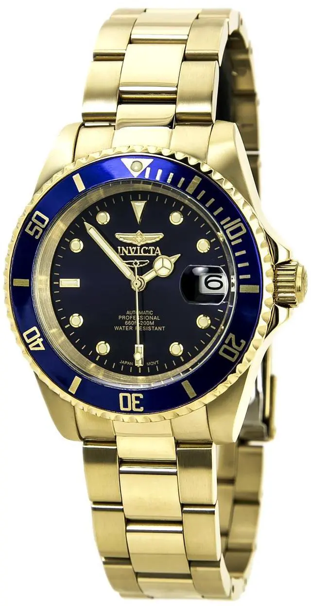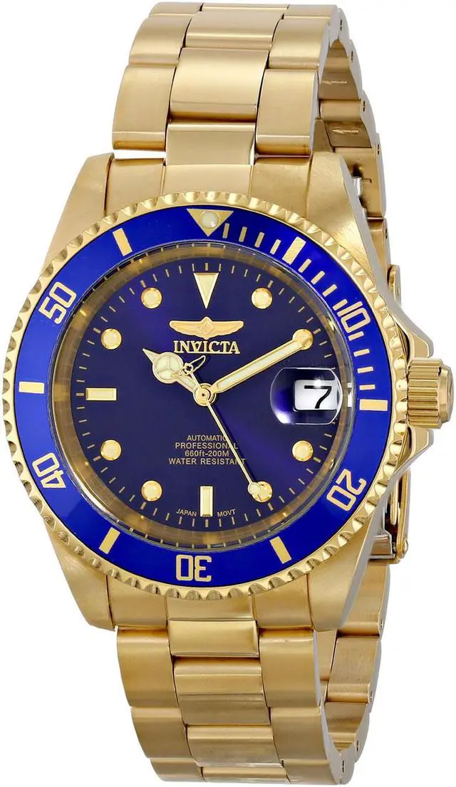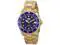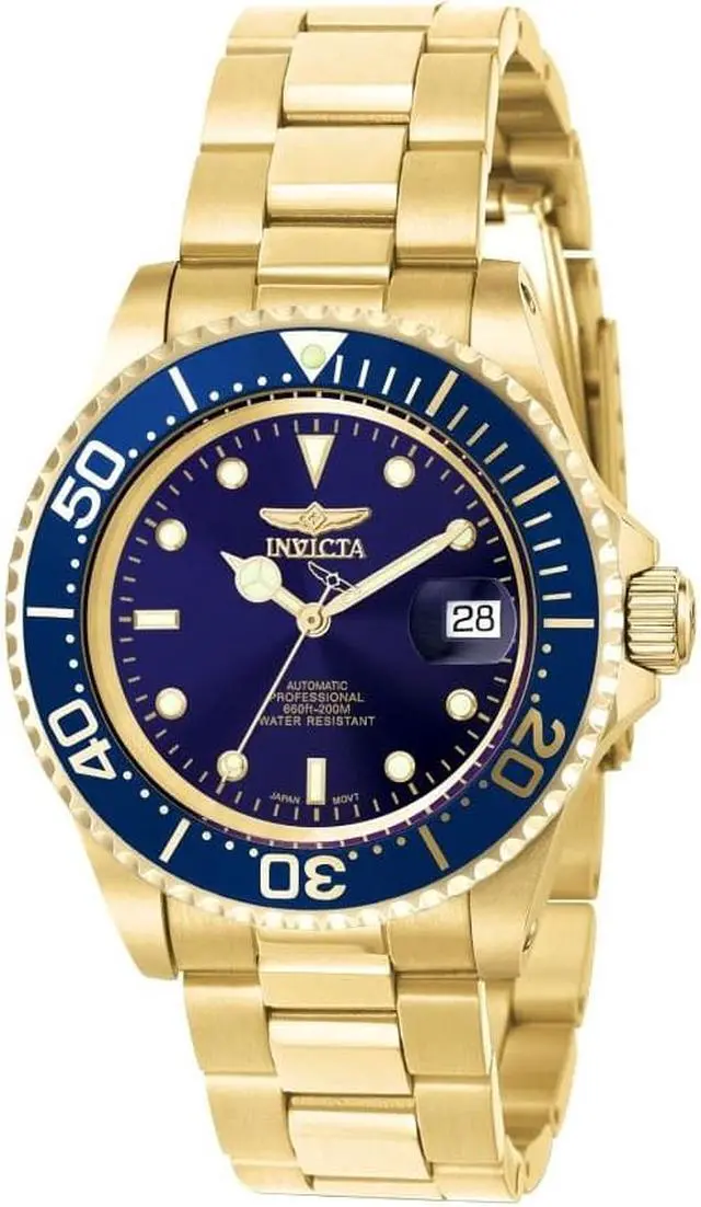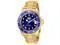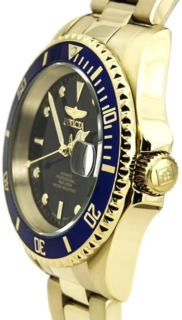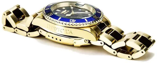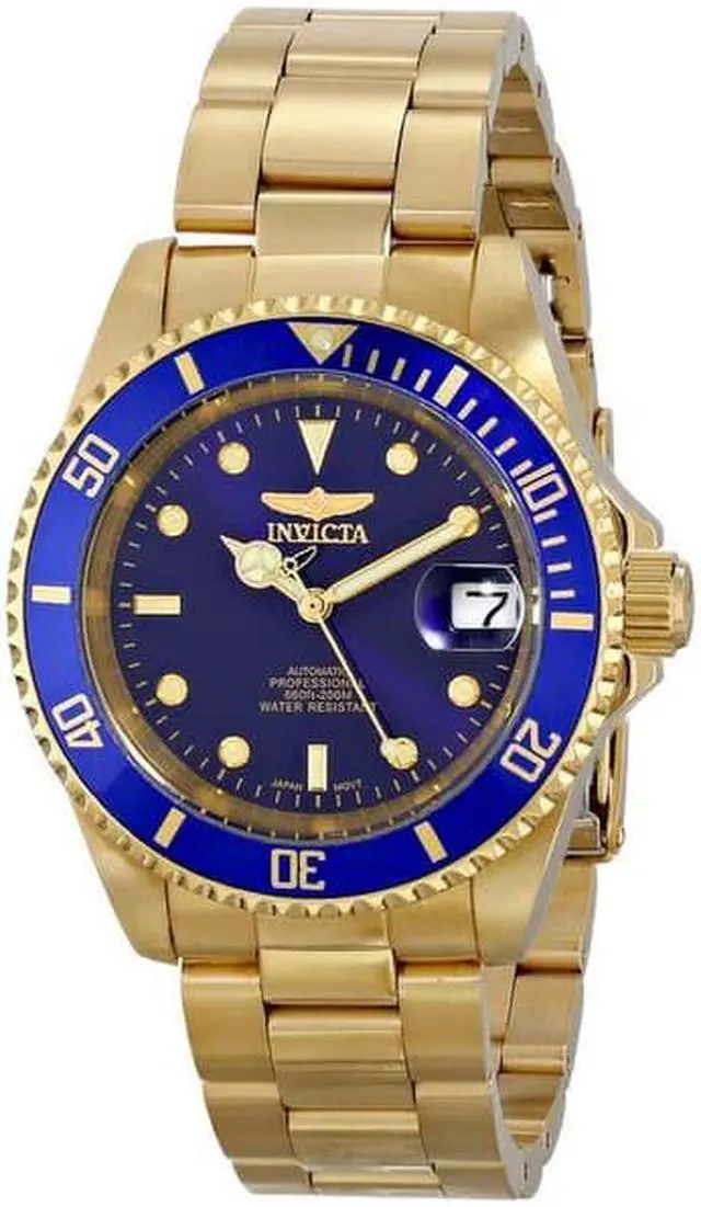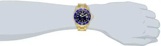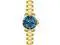 This beautiful timepiece begins with a unidirectional blue and gold bezel, round stainless steel case that surrounds a blue dial, luminous hands and hour markers, magnified date window at 3 o'clock position, screw down crown, protected by mineral crystal and powered by automatic Japan movement. A gold plated stainless steel straps this watch to the wrist, while a foldover safety clasp ensures its secure placement. Finally, this watch boasts water resistance up to 200 meters / 660 feet. Unidirectional blue and gold bezel Round blue dial Luminous hands and hour markers Magnified date window at 3 o'clock Gold plated stainless steel case Screw down crown Scratch resistant mineral crystal Gold plated stainless steel band with foldover safety clasp Automatic Japan movement Water resistance up to 200 meters/660 feet Case diameter: 40 mm Case thickness: 13 mm Band width: 20 mm Band length: 210mm
