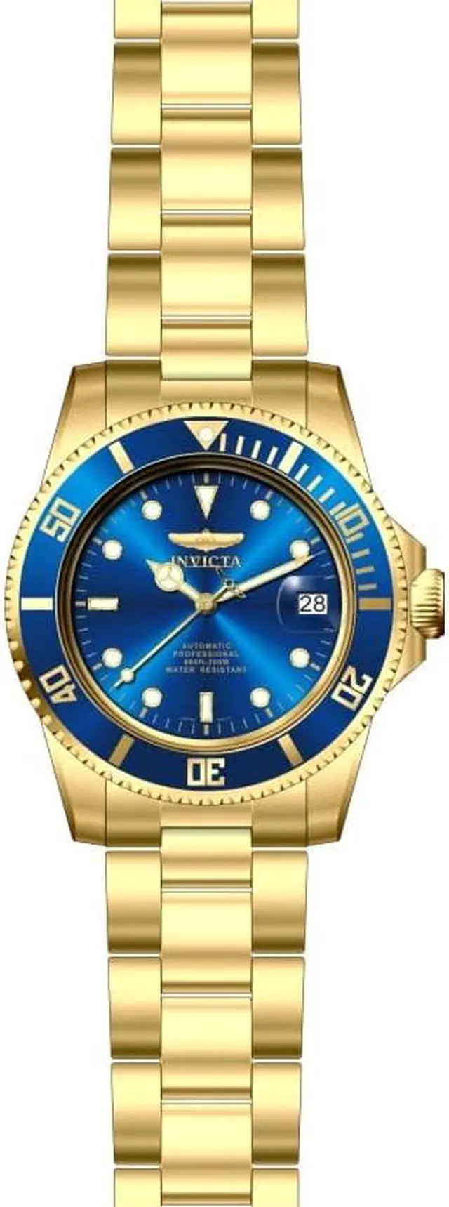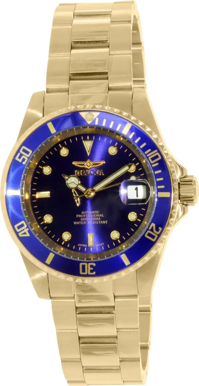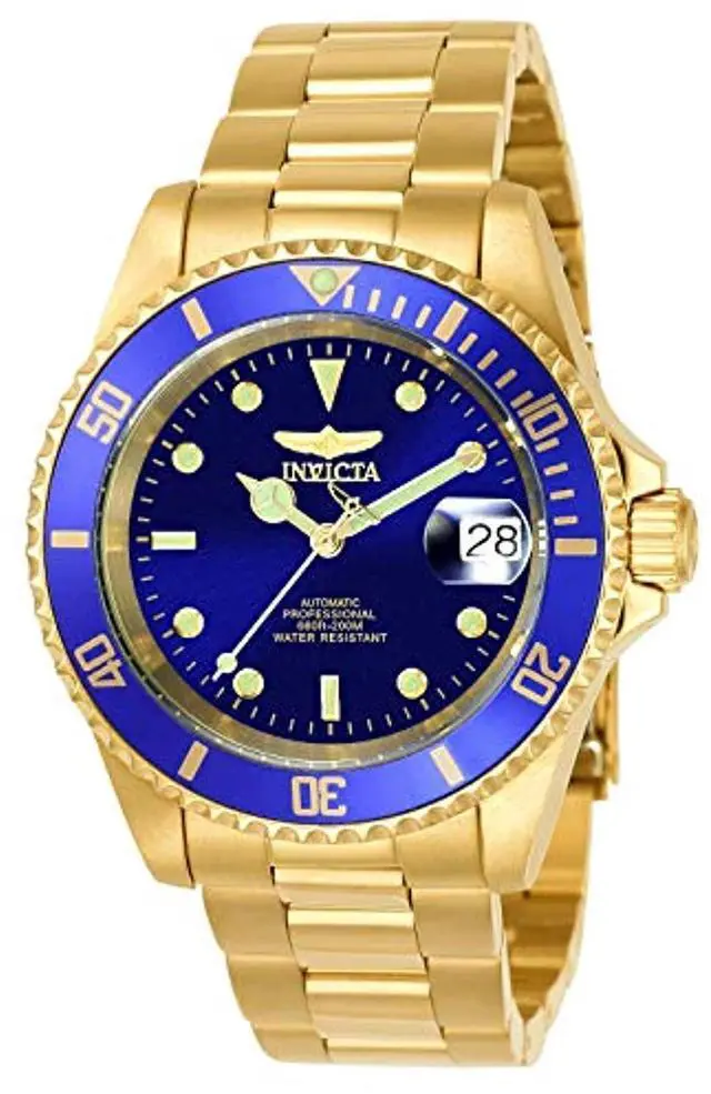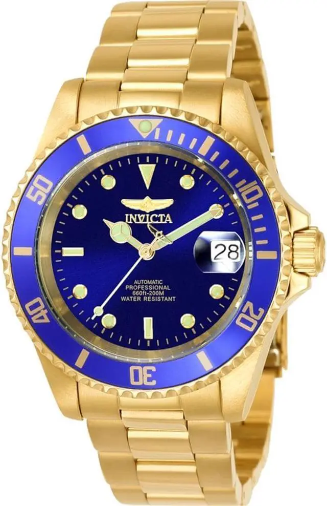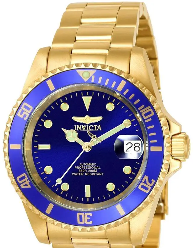 This beautiful timepiece begins with a unidirectional blue and gold bezel, round stainless steel case that surrounds a blue dial, luminous hands and hour markers, magnified date window at 3 o'clock position, screw down crown, protected by mineral crystal and powered by automatic Japan movement. A gold plated stainless steel straps this watch to the wrist, while a foldover safety clasp ensures its secure placement. Finally, this watch boasts water resistance up to 200 meters / 660 feet. Unidirectional blue and gold bezel Round blue dial Luminous hands and hour markers Magnified date window at 3 o'clock Gold plated stainless steel case Screw down crown Scratch resistant mineral crystal Gold plated stainless steel band with foldover safety clasp Automatic Japan movement Water resistance up to 200 meters/660 feet Case diameter: 40 mm Case thickness: 13 mm Band width: 20 mm Band length: 210mm