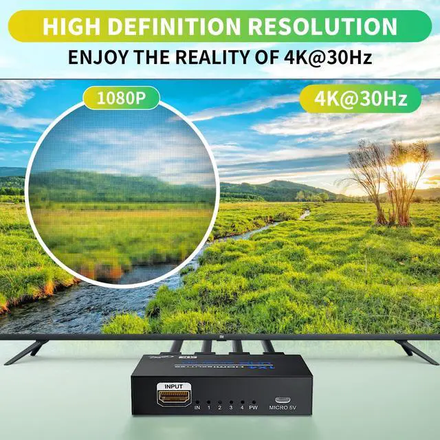 This 4-way HDMI Splitter supports high-resolution 4K Ultra HD video at 30Hz, ensuring crisp, clear, and vibrant visuals, look stunning on all connected displays.