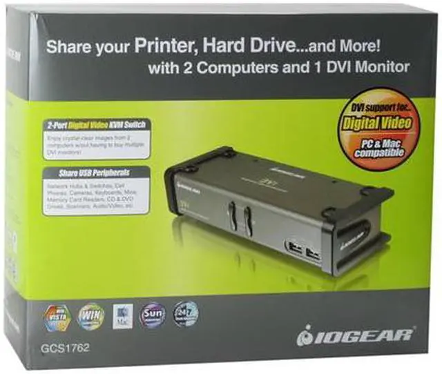 Control Two PCs via One DVI Monitor, Keyboard and MouseShare one DVI monitor, USB keyboard and mouse between two USB-compatible computers using the IOGEAR GCS1762 KVMP switch. The built-in DVI-I connector supports DVI monitors with resolutions of up to 1920 x 1200.