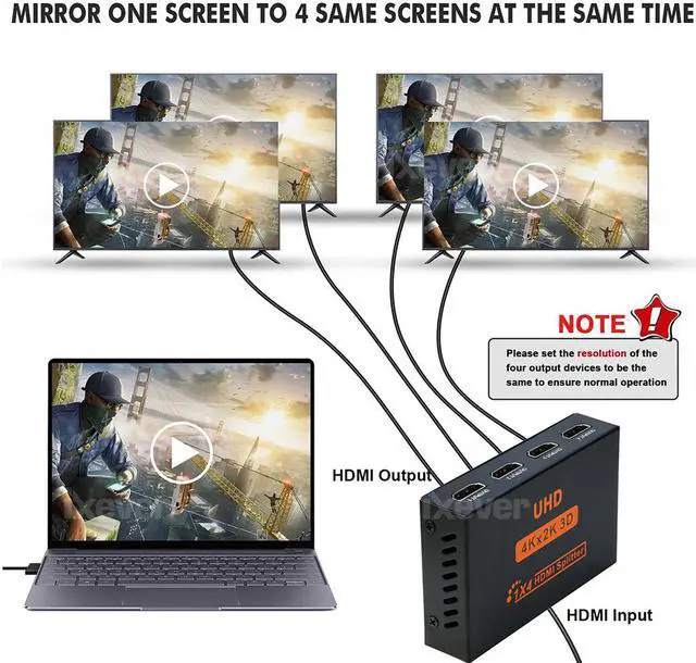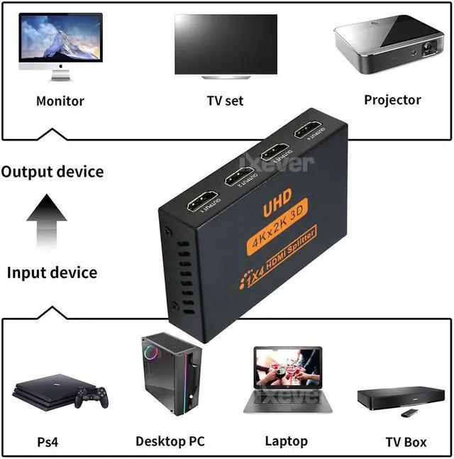 This iXever HDMI splitter 1 input 4 output duplicate 1 HDMI input signal to 4 identical HDMI output signals, transmit video and audio simultaneously without any quality loss.