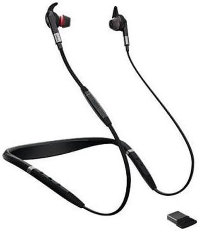 The three-microphone technology creates a unique talk-zone, making sure you are heard, while other nearby voices are filtered out. With an around-the-neck, wireless earbud design. Featuring battery technology similar to that found in your smartphone. It fully charges in just two hours, and that charge provides long hours of battery life. Five buttons for quick control of calls and music, including a smart button for one-touch access to Siri and Google Now and a vibrating neckband to provide silent notifications. Product Type: Earphones - Bluetooth Width: 6.9 in Depth: 7.3 in Height: 2.1 in Weight: 1.76 oz Body Material: Silicone Protection: Waterproof, sweat-resistant, IP54 Max Operating Distance: 98 ft Headphones Form Factor: In-ear - behind-the-neck mount Headphones Technology: Dynamic Connectivity Technology: Wireless Wireless Technology: Bluetooth Available Microphone: Yes Active Noise Canceling: Yes Bluetooth Version: Bluetooth 4.2 Sound Output Mode: Stereo Noise Isolating: Yes Active Noise Canceling Technology: Hybrid ANC Frequency Response: 20 - 20000 Hz Diaphragm: 0.6 in In-Cord Volume Control: Yes Type: On-cable Microphones Included: 3 Frequency Response: 150 - 6800 Hz Controls: Volume, answer/end, play/pause, next/previous track, reject call Connector Type: USB Cables Included: USB cable - 5 ft Included Accessories: Protective case, leaflet, Jabra Link 370 USB Adapter, EarGels and EarWings pack (S/L size) Battery: Headphone battery rechargeable Run Time (Up To): 14 hour(s) Recharge Time: 2 hour(s) Service & Support: Limited warranty - 2 years Product Type: Earphones - Bluetooth - wireless Headphones Form Factor: In-ear - behind-the-neck mount Connectivity Technology: Wireless Wireless Technology: Bluetooth Headphones Technology: Dynamic Active Noise Canceling: Yes Bluetooth Version: Bluetooth 4.2 Sound Output Mode: Stereo Audio Specifications: Frequency Response 20 - 20000 Hz Noise Isolating: Noise isolating Microphone: On-cable Microphones Included: 3 Controls: Volume, answer/end, play/pause, next/previous track, reject call Manufacturer Warranty: 2 years warranty