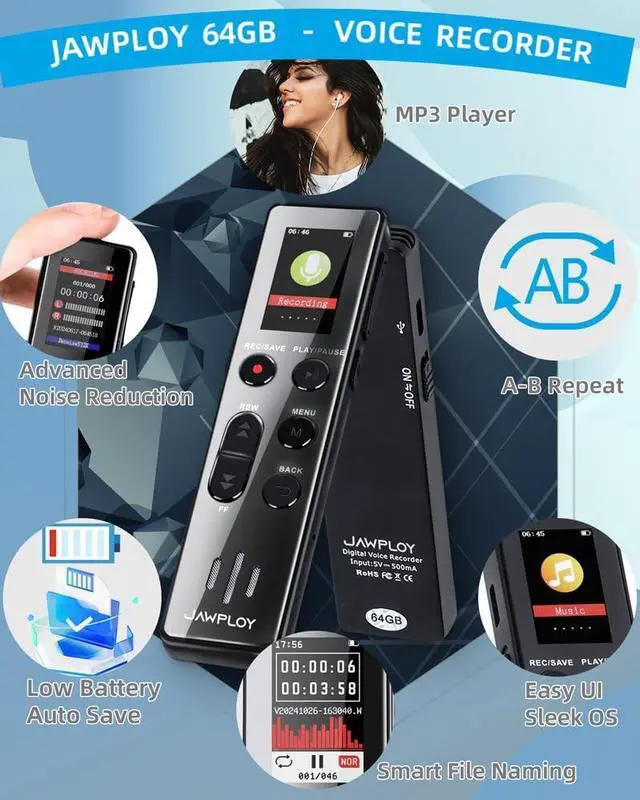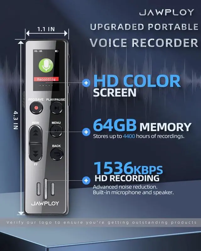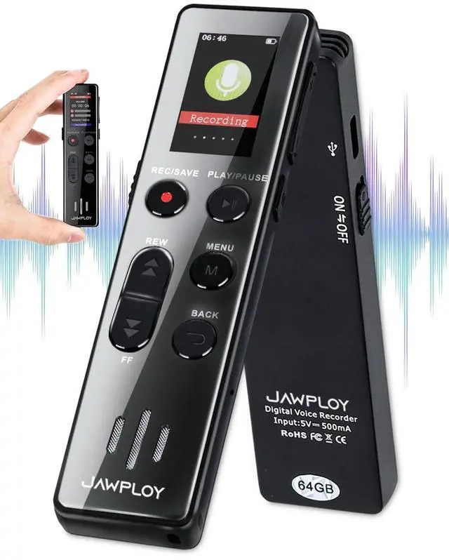 JAWPLOY 64GB digital voice recorder with playback - vibrant color display, HD recording