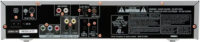 | Compatible Discs | DVD-Audio, DVD-Video, DVD-RW, DVD-R, +RW, +R, CD, CD-R/RW, SVCD/VCD, MP3/WMA/JPEG Digital Still (CD-R/RW, DVD-R/RW), MPEG-4 (ASP)/DivX (CD-R/RW, DVD-R/RW) |