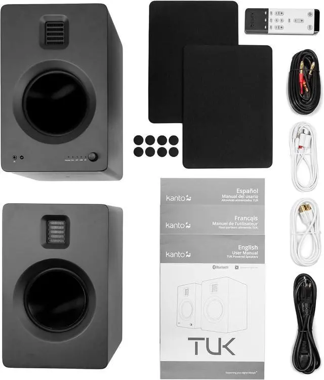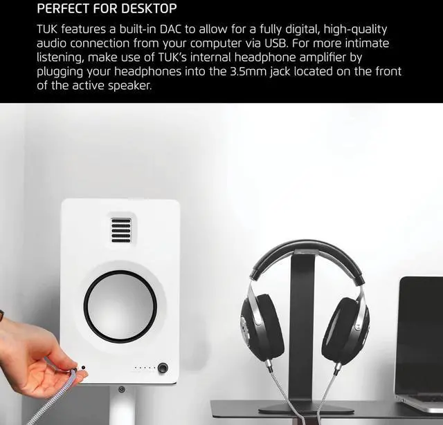 Delivering clarity and performance that put it in a class of its own TUK is designed to push the limits on what a bookshelf speaker can achieve. Fine-tuned with onboard DSP its high-performance AMT tweeters and 5.25 aluminum drivers produce sparkling highs and rich bass bringing life to all your source material. Its active crossover further improves low-end resolution by filtering out sub-80Hz frequencies when connected to a subwoofer. Outfitted with dedicated phono RCA and Optical TOSLINK inputs a built-in USB DAC and headphone amp and Bluetooth 4.2 with aptX HD and AAC codecs TUK provides the flexibility you need to enjoy all your devices.