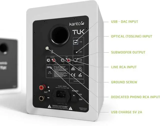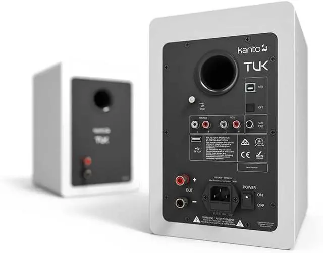 Delivering clarity and performance that put it in a class of its own TUK is designed to push the limits on what a bookshelf speaker can achieve. Fine-tuned with onboard DSP its high-performance AMT tweeters and 5.25 aluminum drivers produce sparkling highs and rich bass bringing life to all your source material. Its active crossover further improves low-end resolution by filtering out sub-80Hz frequencies when connected to a subwoofer. Outfitted with dedicated phono RCA and Optical TOSLINK inputs a built-in USB DAC and headphone amp and Bluetooth 4.2 with aptX HD and AAC codecs TUK provides the flexibility you need to enjoy all your devices.