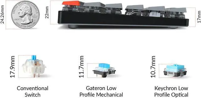 The redesigned low profile switch is 40% slimmer than conventional switches. Together with the streamlined aluminum body makes the K3 one of the thinnest and lightweight wireless mechanical keyboards.