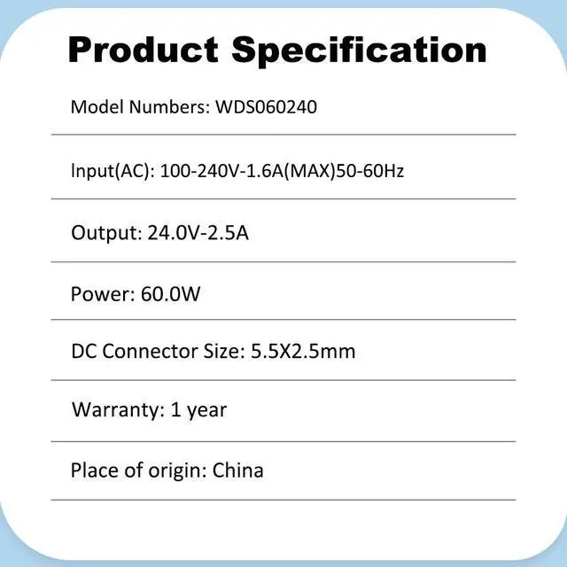 - Output parameters: 24V 2.5A 5.5*2.5mm