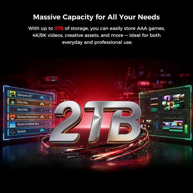 With up to 2TB of storage, you can easily store AAA games, 4K/8K videos, creative assets, and more - ideal for both everyday and professional use.