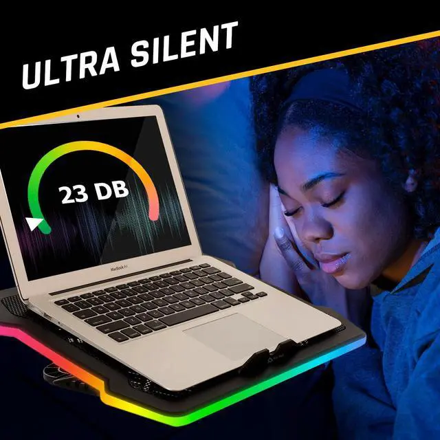 • ULTRA SILENT. This laptop cooling pad features a powerful fan that spins at 750 RPM and creates a large airflow to cool your computer with minimum noise.
