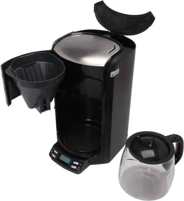 | Features | Full standard 12-cup capacity with 60 oz. water reservoir 1100 watts provides fast efficient brewing Programmable clock to set the daily start time of the brew cycle – coffee is ready when you are Programmable auto-off from 1 – 5 hours Flavor control aroma switch maximizes flavor extraction DuoFilter water filtration system removes chlorine for better taste and reduces mineral deposits for longer machine life Cascading brew head delivers a shower of hot water to ensure even flavor extraction Pause and serve feature allows interruption any time during the brew cycle – just remove the carafe Empty water reservoir detection shuts unit off automatically if empty High visibility blue illuminated LED control panel for ease of use Audible signal when brewing is complete Descaling indicator measures brew time and calculates when descaling is necessary |