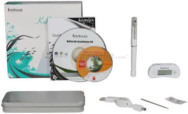 | Package Contents | Kanvus KuPen Air Receiver and Pen (Including 2 Batteries) KuPen Ink Refill Quick Start Guide Kanvus Metal Carry Case KuPen Air Installation CD MyScript Notes 2.2Lite Installation CD USB Cable |