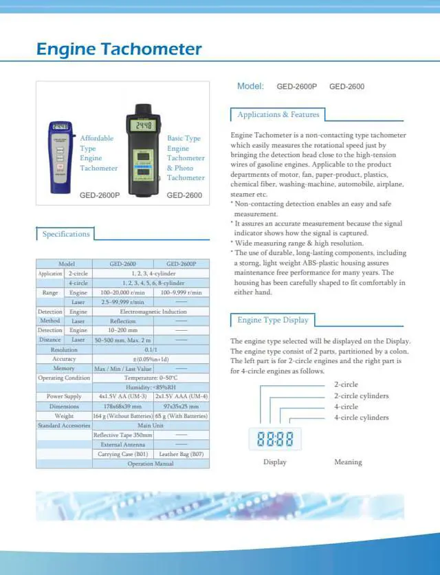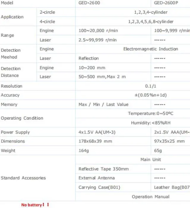 Spec:Application: 2 in 1 (Engine & Laser tachometer ) Applicable to the product departments of motor, fan, paper-product, plastics, chemical fiber, washing-machine, automobile, airplane, steamer etc.