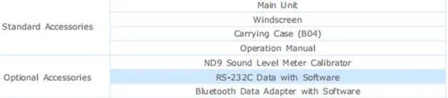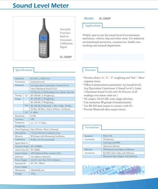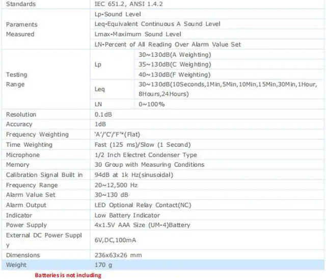 * Offers 4 measurement parameters: Lp (sound level); Leq (Equivalent Continuous A Sound Level ); Lmax ( Maximum Sound Level) and LN (Percent of all readings over alarm value set ).