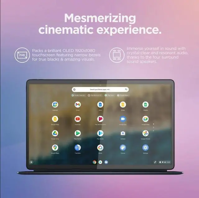 The thin and light 13.3 inch Duet 5 Chromebook now packs a brilliant OLED 1920 x 1080 touch screen featuring narrow bezels for true blacks and a cinematic experience, as well as four speakers for clear and resonant audio. It delivers exceptional performance, thanks to the Snapdragon processor paired with 4GB RAM. This product is certified refurbished with 90-day warranty!!