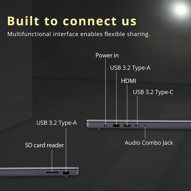 • Windows 11 Pro: 13.52"x9.51"x0.7", 3.52 lbs. Ports: 2x USB Type-A, 1x USB Type-C, 1x SD Card Reader, 1x HDMI, 1x Audio Combo Jack. WiFi 7+Bluetooth 5.4. Bonus Docking Station Set: 1x 7-in-1 Docking Station with 1TB Storage, 1x 32GB MicroSD Card with Adapter, 1x Type-C Data Cable, 1x 3-in-1 Charging Cable, 1x Suede Cleaning Cloth.